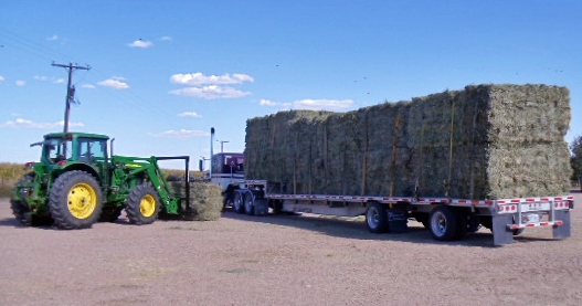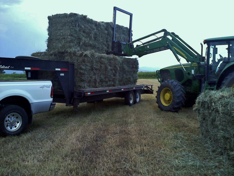 After the hay is baled we use a machine that bands 21 small bales together. The bundles are solid and self supporting, quick and easy to move, ideal for hauling on flat beds, in van trailers, or in the back of a pickup truck. The bales weigh between 60 and 70 pounds and a bundle will weigh between 1260 to 1470 pounds. We can load your trailer or flatbed in a very short time.
