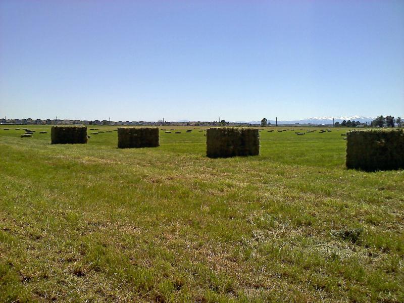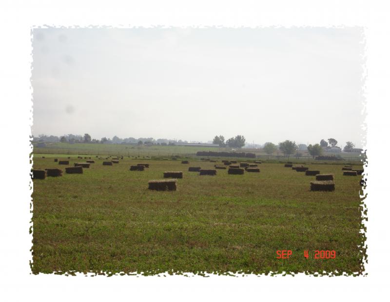 Every summer we produce an average of 750 to 800 tons of grass and grass/alfalfa hay from large irrigated fields. The grass is a mixture of orchard grass, brome grass, and timothy. Although we need a considerable amount for our own livestock we always have extra for sale. Our hay is kept in large haybarns or outside in covered stacks until sold or used.